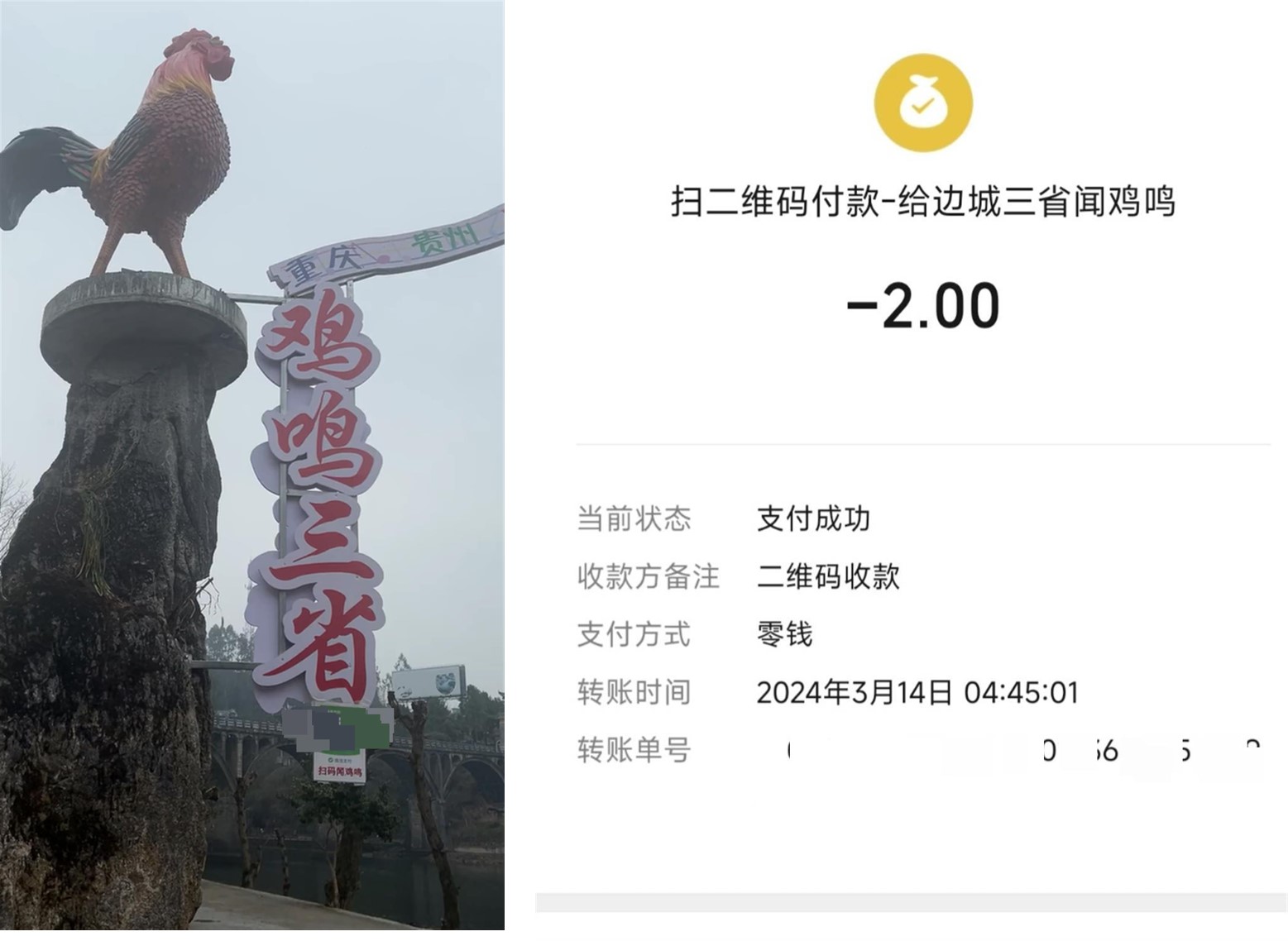最近網(wǎng)上有個(gè)娛樂事件:在重慶、貴州、湖南三地交界的邊城,一農(nóng)家樂門口安放了一只公雞雕塑,并懸掛二維碼,游客掃碼支付二元后...